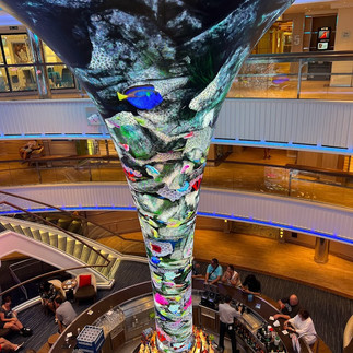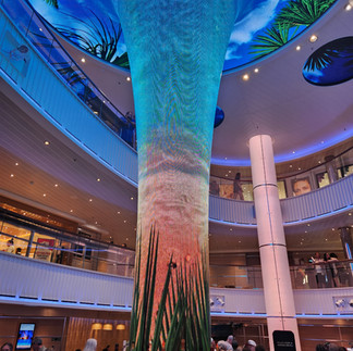 Mid-ship you will find the promenade, a captivating centerpiece spanning three decks, where innovation meets entertainment. At its heart lies a mesmerizing digital pillar, a dynamic canvas constantly evolving with captivating visuals, setting the stage for unforgettable moments.